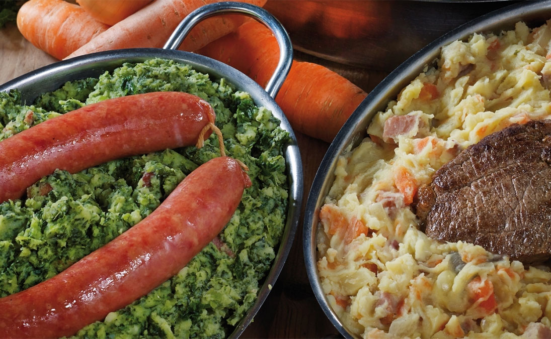 Laten we zeggen dat wij Nederlanders graag bekend staan als directe recht-door-zee mensen. Het motto is toch “doe maar gewoon, dan doe je al gek genoeg”. Dat is en was culinair ook het geval. We aten om energie in het lichaam te krijgen, nodig voor de zware arbeid op het land. En vaak ook de afwezigheid van de financiële middelen voor duurdere ingrediënten en onze zuinige calvinistische karakter eigenschappen weerhielden ons ervan om een uitgebreide Nederlandse keuken met bijzondere gerechten te ontwikkelen. Tijdens de oogstmaanden (eind juli tot begin oktober) was het wel handig wanneer er energie rijke, goedkope en snel te maken gerechten op tafel kwamen want de zomerse dagen waren lang en het werken zwaar. En zo is onze “een-pans-gerecht” cultuur ontstaan. Niets mis mee overigens! Dus de pan, op de bodem de aardappel, daarboven de groente en indien mogelijk spek en/of rookworst. Het grappige is echter dat het stampen pas aan het einde van de negentiende eeuw is begonnen (1880 in De hedendaagse kookkunst van Maria Haezenbroek). Het oudste recept van een stamppot is een andijvie stamppot en komt uit 1929 en is door de historicus Roel Mulder gevonden in het plaatselijke krantje De Holevoet van Scherpenzeel. Bedenk ook dat de aardappeleters van Vincent van Gogh in 1885 is geschilderd en komt dus uit ongeveer dezelfde tijd.