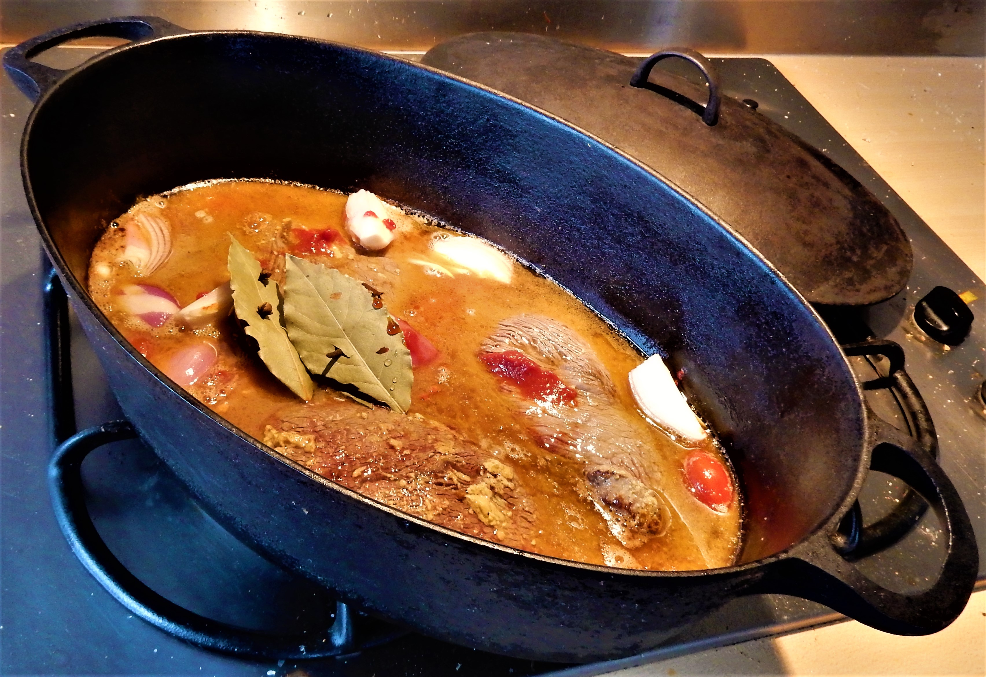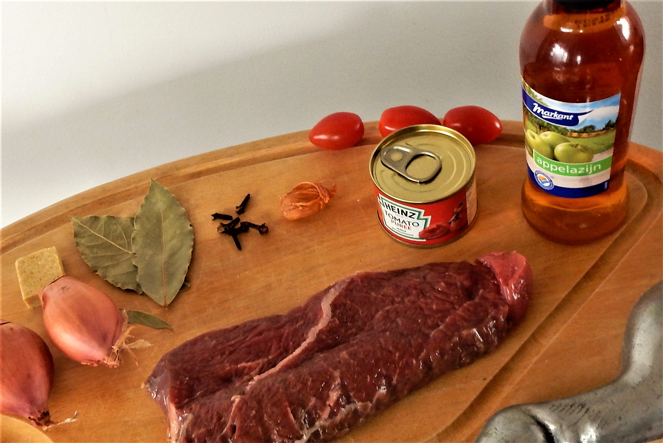 Eerst de tomatenpuree, dan de azijn of rode wijn. Dan laurierblad met de kruidnagels, en de foelie. Giet de warme (anders schrikt het vlees en wordt taai) bouillon in de pan en voeg een eetlepel echte Hollandse appelstroop toe.