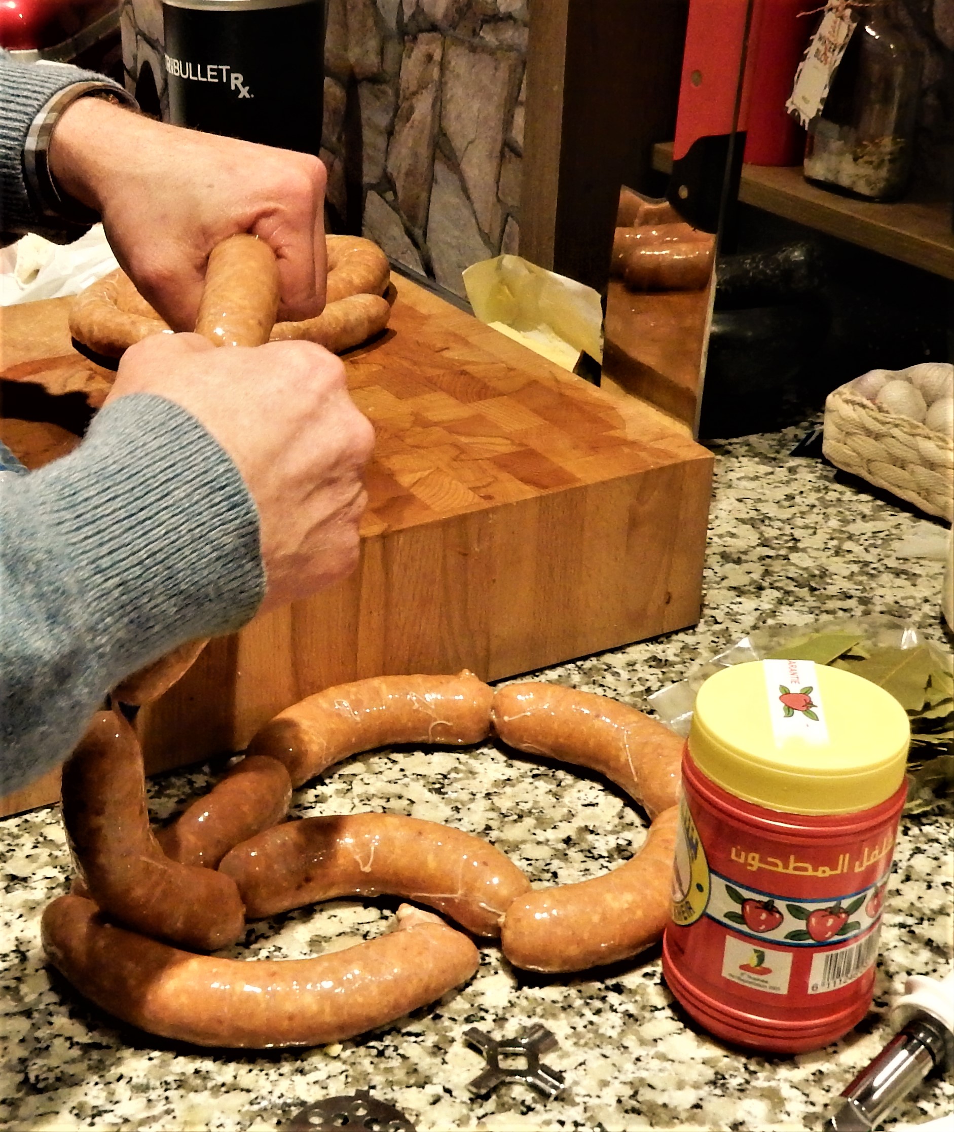Neem de lengte van een worstje (ongeveer 20 cm) en draai de darm van je af. Pas dan het volgende worstje af en draai naar je toe. Als je dat om en om doet blijven de worstjes onafhankelijk van elkaar in tact. Knip nu door en leg de verse worstjes apart.