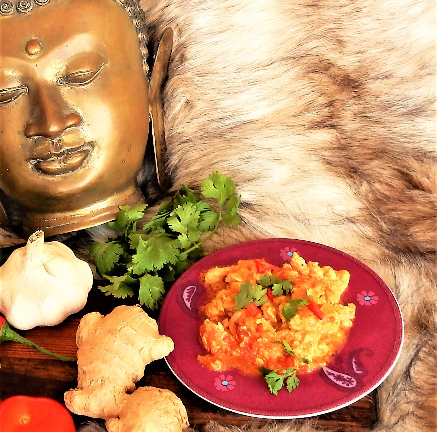 Strooi er vers gesneden koriander over. Kloddertje yoghurt. Serveer met rijst of Naan of Roti Jala. Lekker met raita en chutney.