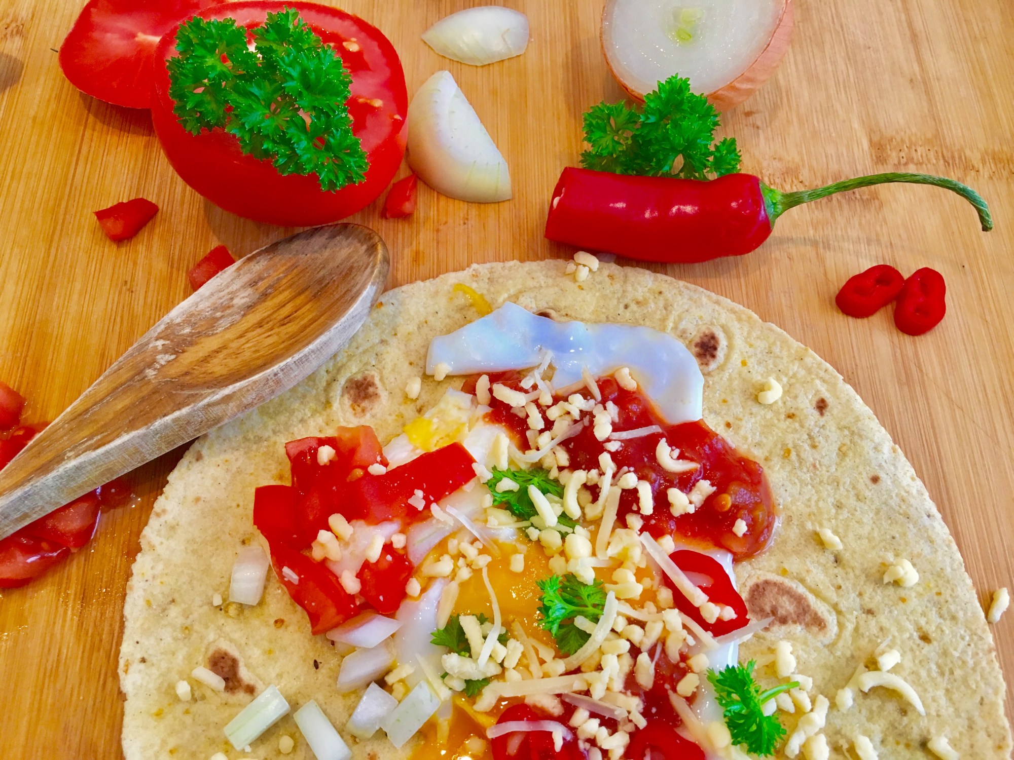 In de tweede pan frituur je twee tortilla’s voor 30 seconden per zijde. Leg ze ieder op een bord. Bak twee eieren, niet te lang, het mag nog zacht blijven. En leg op elke tortilla een ei. Bedek het ei met de hete salsa, het ei kookt hierdoor nog door en wordt lekker stevig.