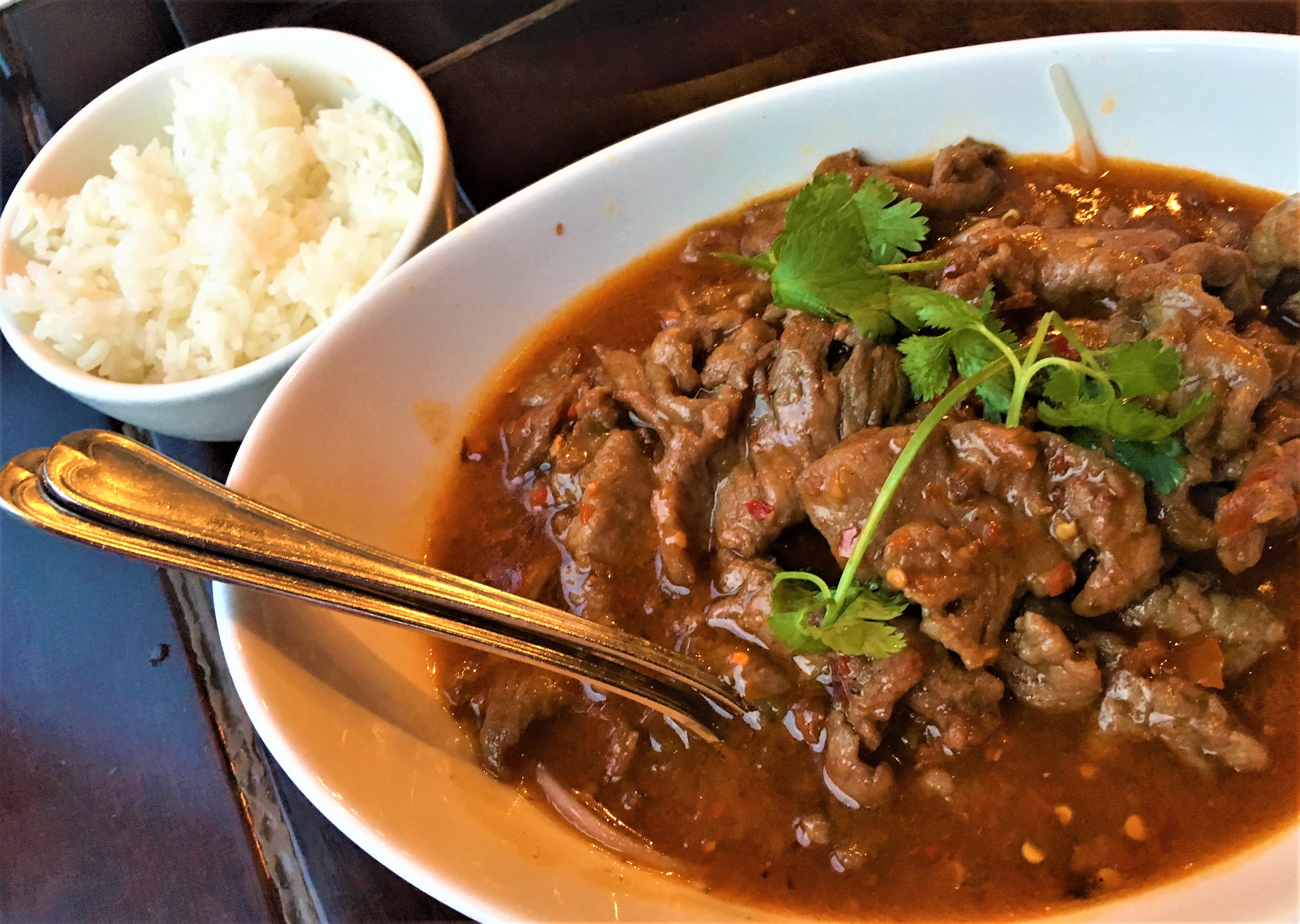 Goed, terug naar het restaurant sānsān van eigenaar Zhang Hu. Sān (三) betekent drie, en sānsān dus 33, een knipoog naar het adres Hang 33 in Rotterdam. Het nummer is geen geluksnummer in China maar wel in Nederland natuurlijk. In China is het een goed nummer want het staat voor leven of het leven. Geopend op 23 april 2012 met een mooi modern interieur ontworpen door James Chiew Design uit Rotterdam is het heerlijk eten tussen overwegend Chinese mensen dus blijkbaar zijn de smaken ook voor hen identiek. Geruststellend! Wij hebben ossenhaas gegeten (sour & spicy beef), mooie grote portie met een zeer pittige saus over echt mals vlees op een bed van taugé. Veel Umami, heerlijk. De mix van azijn (?), knoflook, gember, chili, sesam olie en koriander wervelt door je mond en doet je verlangen naar de volgende hap.