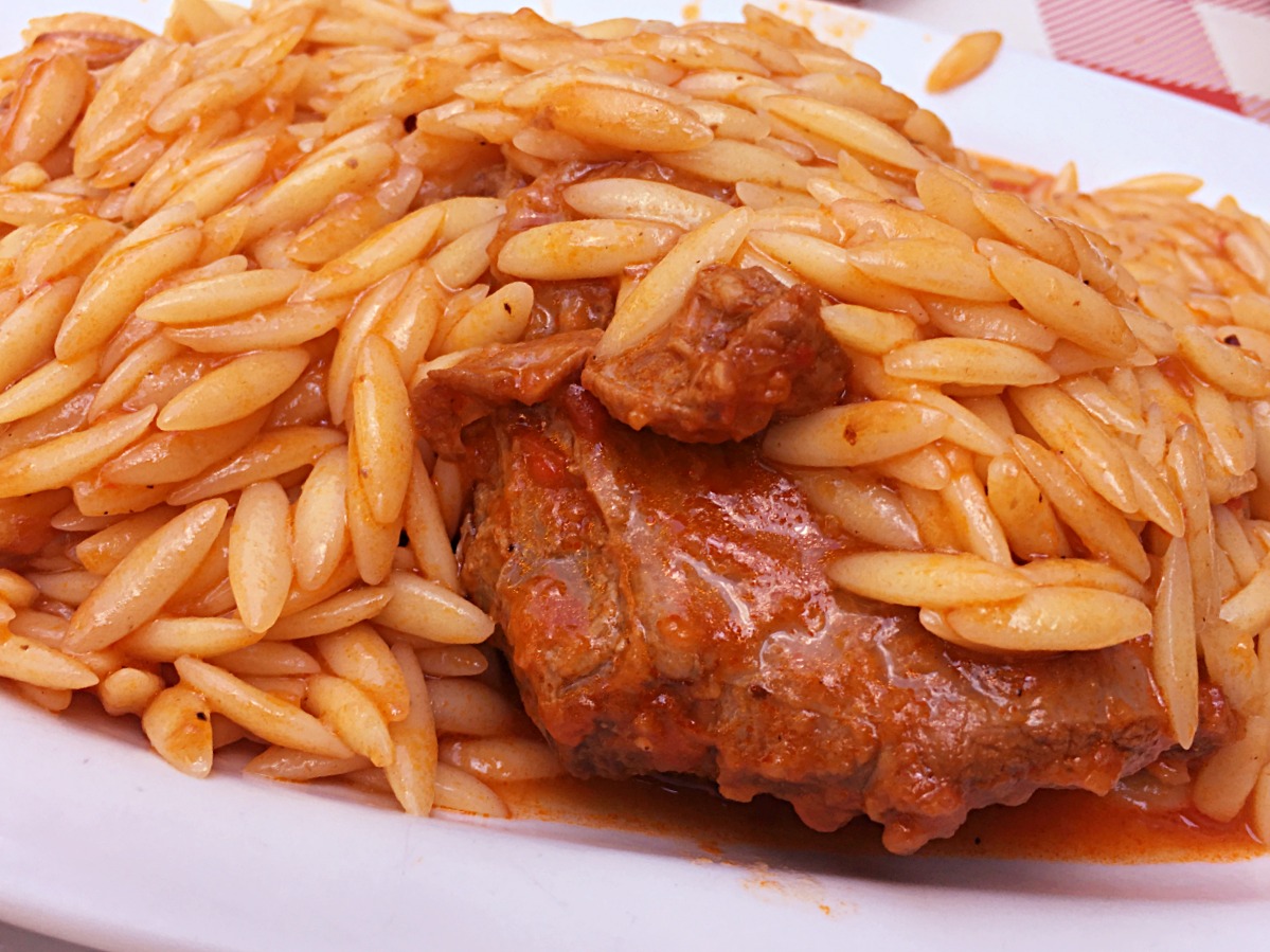 Sutsukakia (σουτζουκάκια). De beroemde Griekse gehaktballetjes in tomatensaus is in elk restaurant te bestellen. Lekker kruidig (knoflook, komijn), let wel op dat het door de kok zelf is gemaakt want je wil het nog wel eens opgewarmd uit blik krijgen. Lekker met Griekse patat (vers gesneden aardappel gefrituurd in olijfolie).