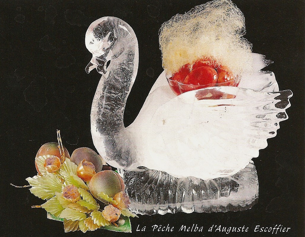 Nellie was innig bevriend met Escoffier en at vaak in zijn restaurant in het Savoy hotel in Londen. In 1894 kreeg Escoffier kaartjes voor Nellie’s optreden in Wagner’s opera Lohengrin als Elsa. Daar kwam een prachtige scene in voor van een witte boot in de vorm van een zwaan, toen nog heel origineel! De volgende dag kreeg de mooie Nellie een toetje van vanille ijs met rijpe sappige perziken in een zilveren schaal op een zwaan gehakt uit ijs gepresenteerd. Hij noemde het “perzik met een zwaan” (Pêche au Cygne). Later in de Ritz Carlton in London serveerde hij het toetje met een mooie frambozenpuree (Melba saus) en noemde het Pêche Melba. Escoffier was natuurlijk verliefd geworden en heeft ook de Melba toast, de Melba saus en de Melba garnituren naar haar genoemd.