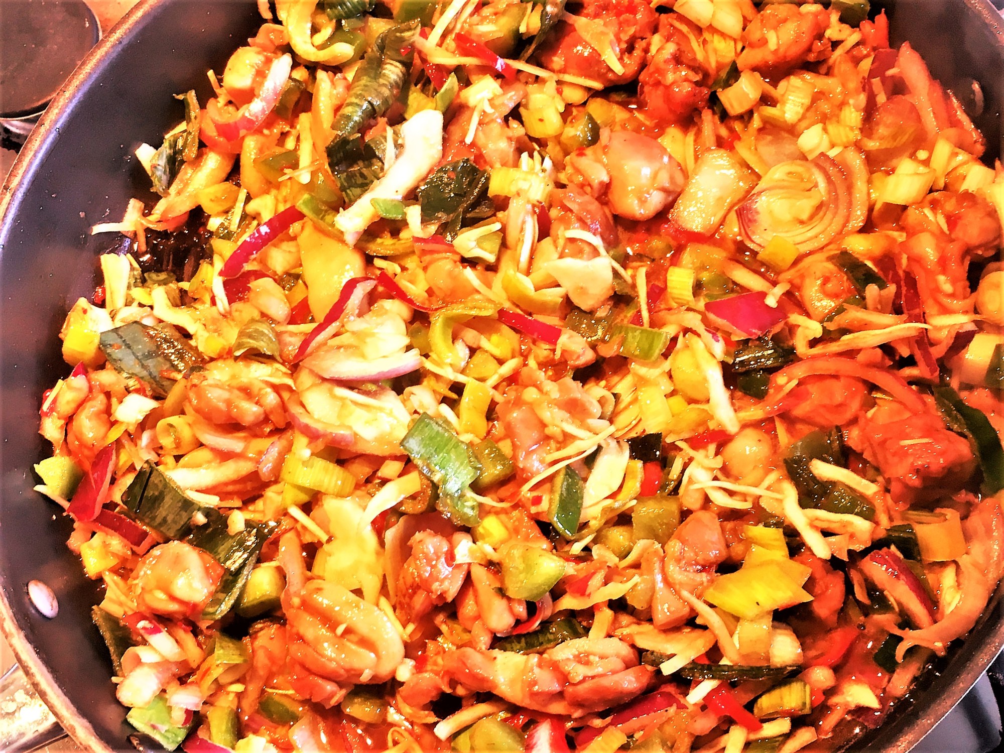 Voeg de twee zakken groente toe plus de kippenbouillon en de overgebleven marinade. Nu gewoon roerbakken en er wat smaakmakers aan toevoegen. Dat hangt erg af van je persoonlijke smaak. Ik doe er eerst een flinke eetlepel pindakaas in (liefst met nootjes), daarna scheutje sojasaus, en een beetje gember stroop. Voor pittig, roer er naar smaak sambal daarheen. Nog even roeren en klaar.