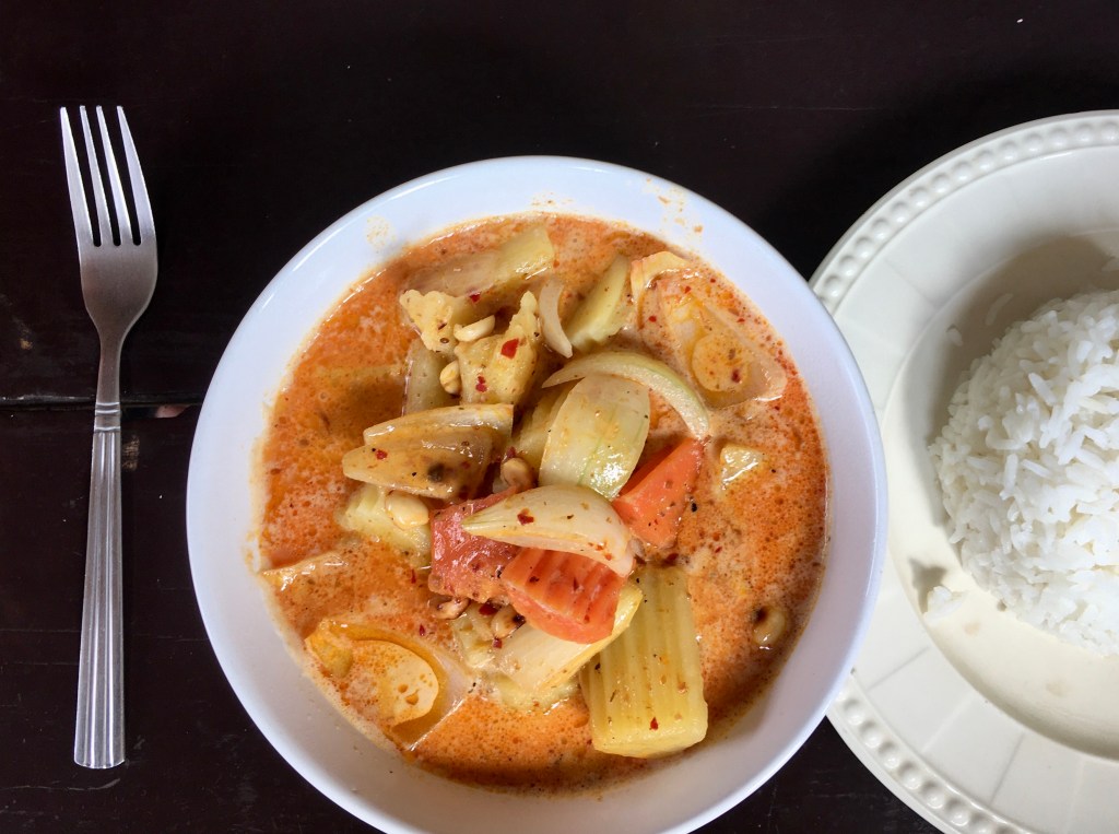 Fruit 1 rode ui en twee teentjes knoflook in een beetje kokosolie. Voeg twee eetlepels rode curry paste (zelf gemaakt of gekocht in de supermarkt) toe en fruit het mengsel. Voeg nu kokosmelk toe naar smaak, kokos crème kan ook als je de curry wat dikker wilt hebben. Dit is de basis. Met toevoeging van medium (kip, rund, varken, garnaal, tofu, jackfruit) en daarna groente maak je de curry af. Serveer in een kom met gestoomde rijst. Het is het altijd leuk om voor de gasten er wat kleine schaaltjes met smaakmakers bij te zetten. Lekkere frisse partjes limoen bijvoorbeeld, of fijngesneden koriander en wat dacht je van een schaaltje gehakte pinda’s of rode paprika.