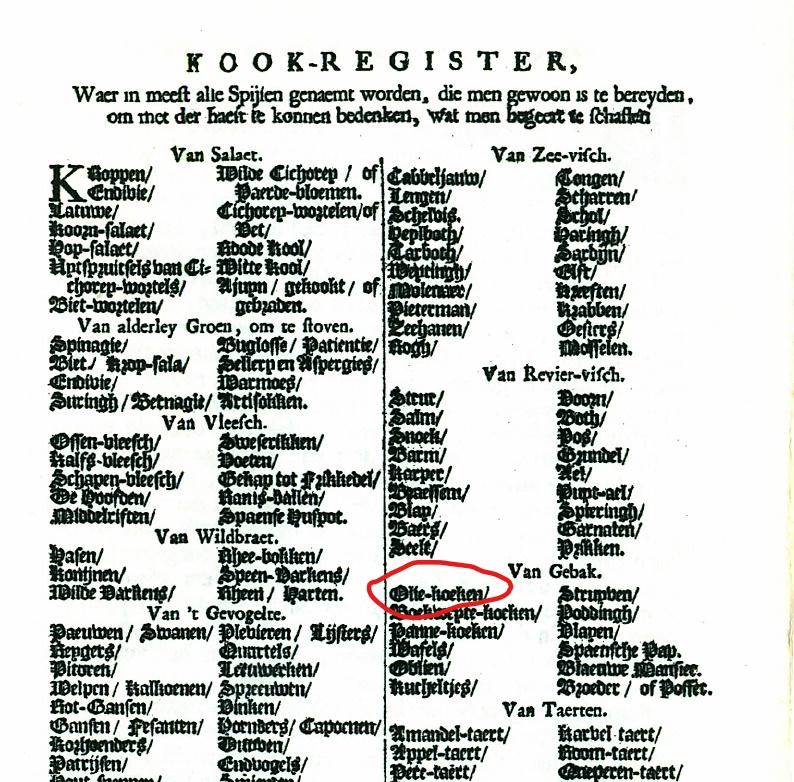 Algemeen wordt aangenomen dat het eerste oliekoek recept in de De verstandige kock, oft Sorghvuldige huyshoudster … staat, gedrukt door Reynier Sleghers in 1667 (pag 21 – 22). Het recept heb ik onderaan deze blog voor de aardigheid opgenomen. Oliekoek werd in die tijd gebakken in niet al teveel raapolie en dus bleef de koek plat, maar dit recept toont al aan dat er 1,2 ltr olie wordt gebruikt waardoor er oliebollen ontstaan. De latere recepten zijn, net als tegenwoordig, met heel veel olie. Onze beroemde schilder Albert Cuyp (1620 – 1691) maakte er in 1652 al een leuk schilderij van.