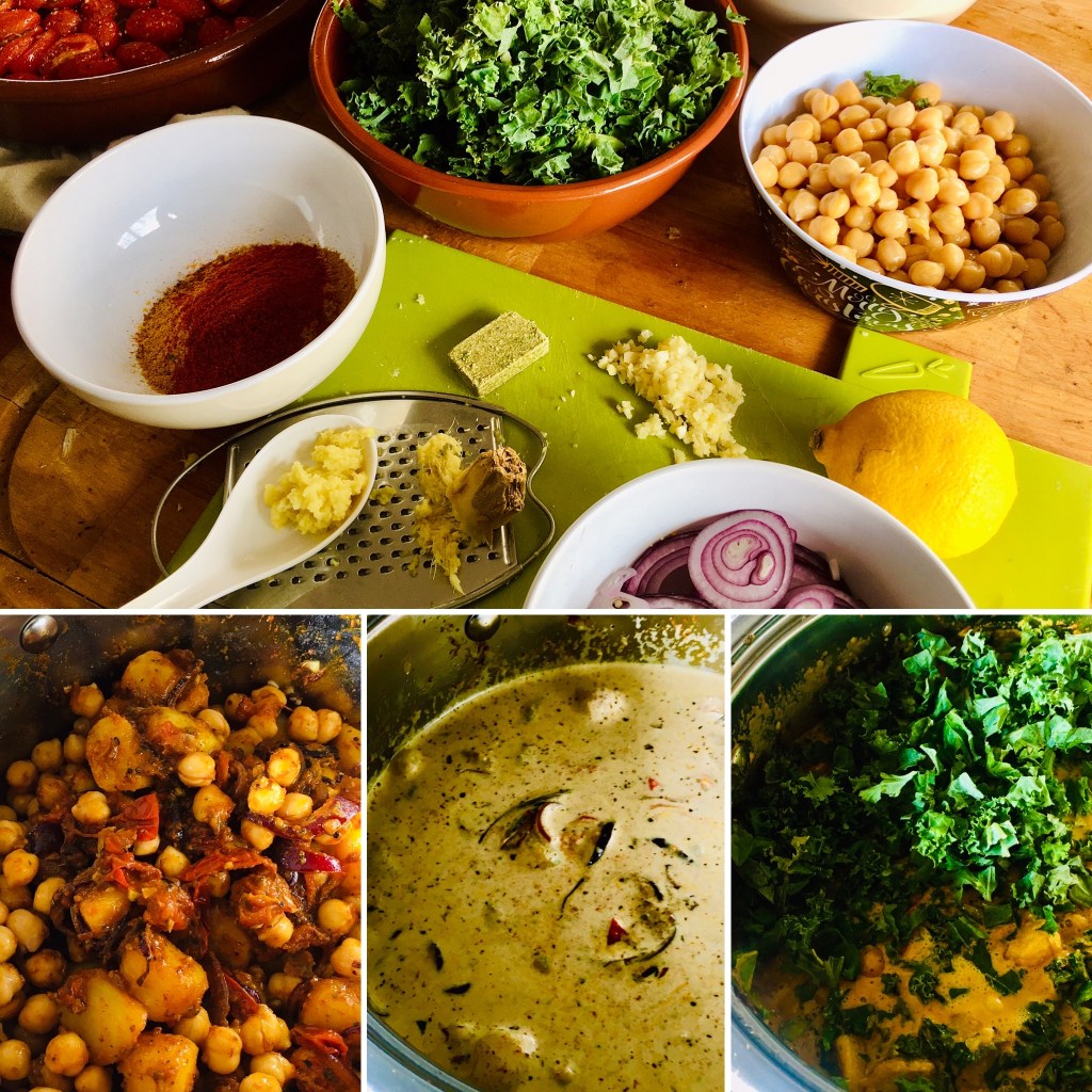 Doe de olijfolie in de pan en fruit de ui rustig op een laag vuurtje in 5 minuten glazig. Voeg dan de knoflook en de gember toe. Fruit nog een minuutje. Gooi nu de kruiden, die je natuurlijk klaar hebt staan in een schaaltje, erbij en laat alles mooi geuren op laag vuur. Voeg nu de aardappels, de tomaat, citroensap, en de kikkererwten toe. Tijd voor wat vocht. Doe de kokosmelk in de pan met het bouillonblokje en roer alles goed door elkaar. Breng aan de kook, daarna, op laag vuur, laat je alles een kwartier stoven met de deksel op de pan. (Heb je rauwe aardappel dan stoof je 45 minuten).