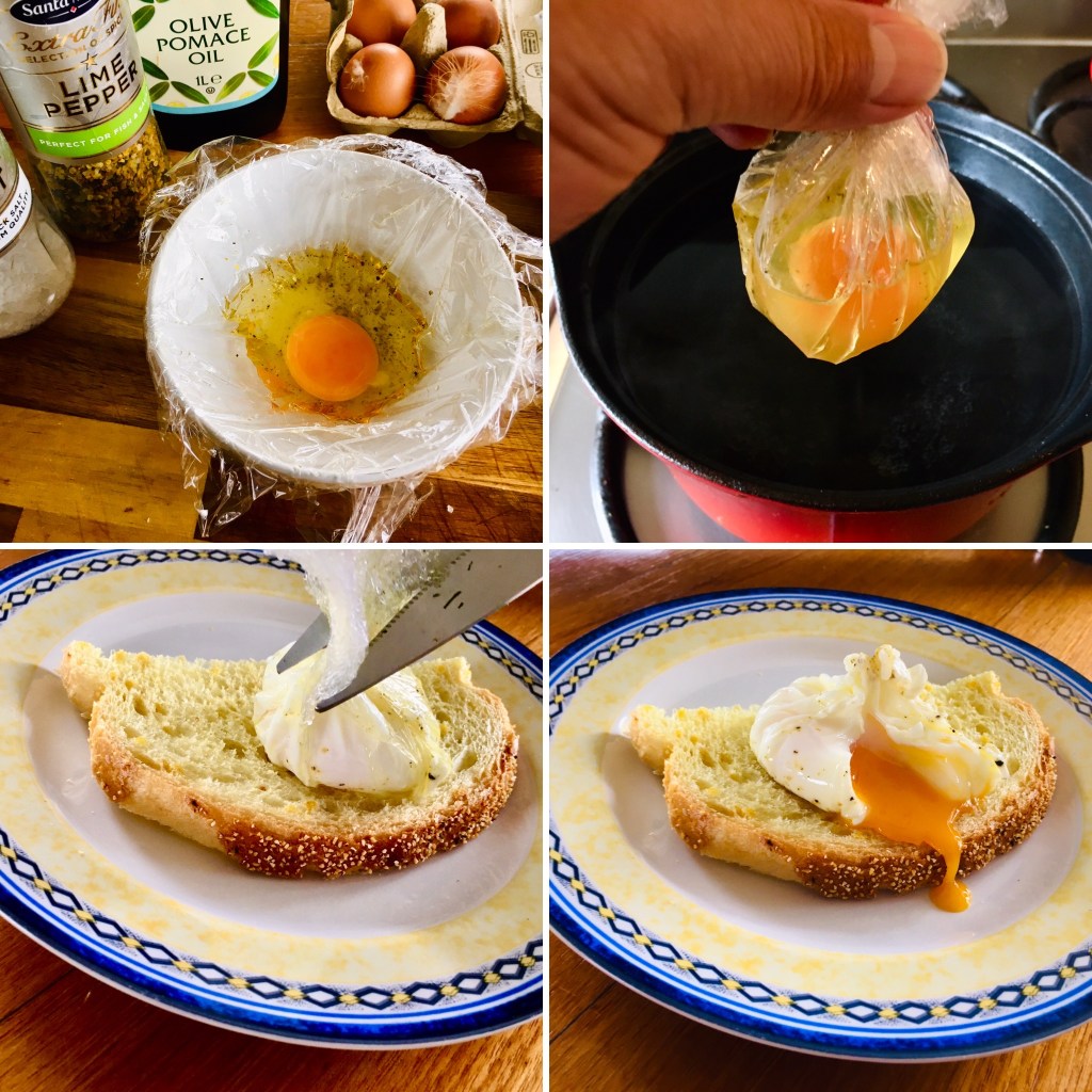 Leg de vershoudfolie in het kommetje en smeer in met de olijfolie, peper en wat zout. Breek nu voorzichtig een ei in de folie. Knoop nu de folie dicht en leg het zakje ongeveer 3 minuten in net niet kokend water.