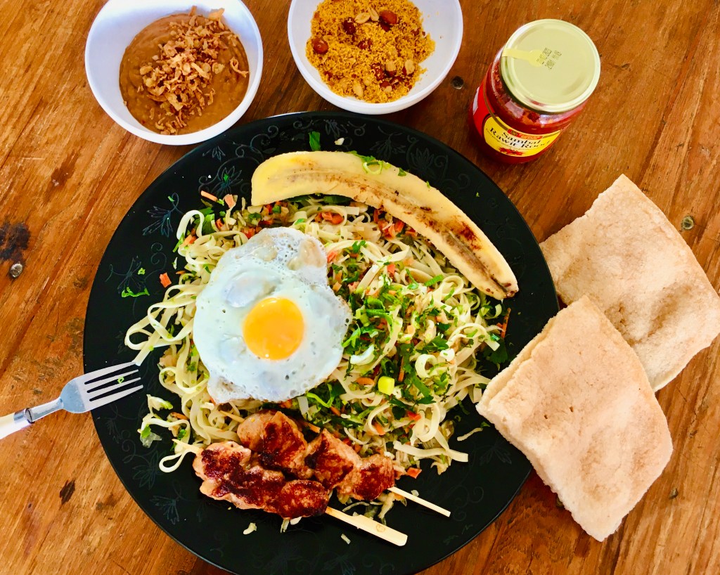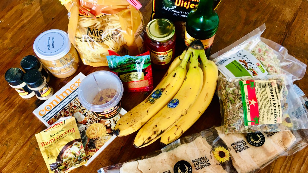Nu hebben we een bami goreng. Het gerecht wordt echter “speciaal” door de bijgerechten die erom heen worden geserveerd. Ik kom zelf uit de 60ger jaren (geboren 1954) en heb dus de smaken van Conimex in mijn hoofd die mijn moeder altijd in haar keuken gebruikte! Dus ik doe er kipsaté bij met pindasaus, gebakken ei en natuurlijk een gebakken banaan!