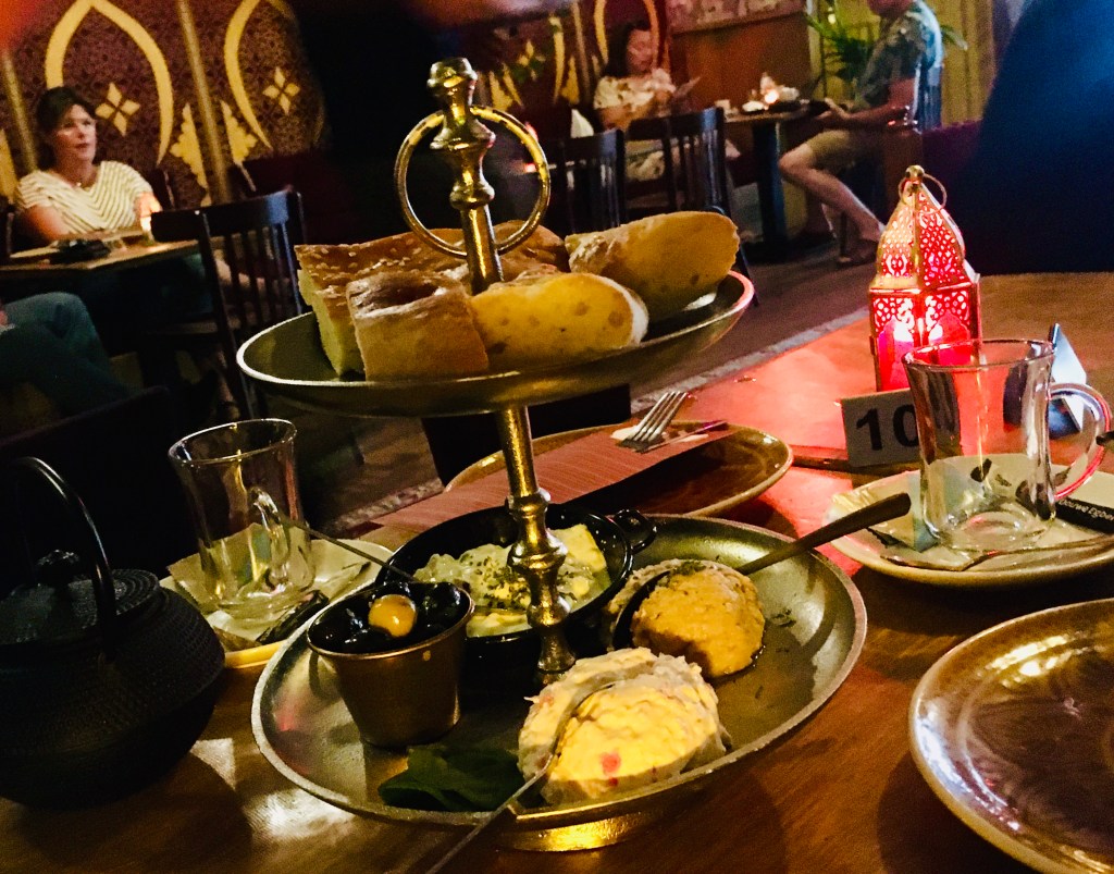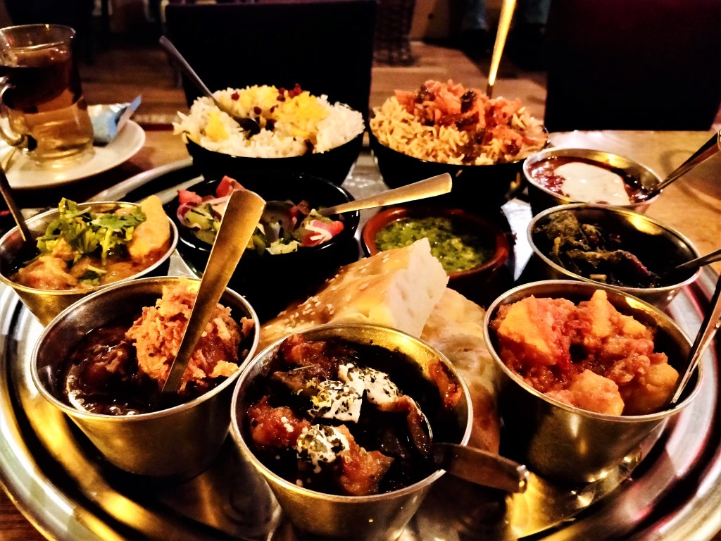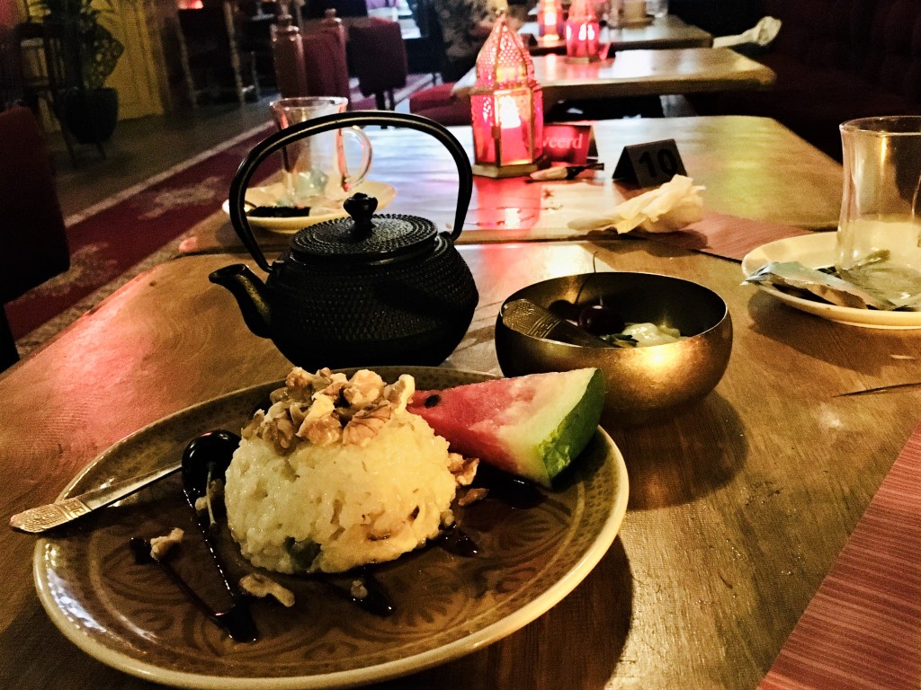 Ik denk dat het altijd leuk is om van alles te proeven en Masud heeft daar speciale hoofdmenu’s voor op de kaart gezet, bestaande uit zelfgemaakt Afghaans brood met drie dips (humus, tzatziki en een tapenade) gevolgd door 6 verschillende curry’s met rijst, mooi geserveerd in kleine porties zodat je wel alles kan proeven maar ook nog ruimte overlaat voor het dessert. Wij namen de vlees/kip variant maar er is ook een vegetarische en vegan versie (en alles is halal). Thee is het nummer 1 drankje in Afghanistan dus dat namen we (kardemon thee) of natuurlijk dogh het frisse yoghurt drankje.
