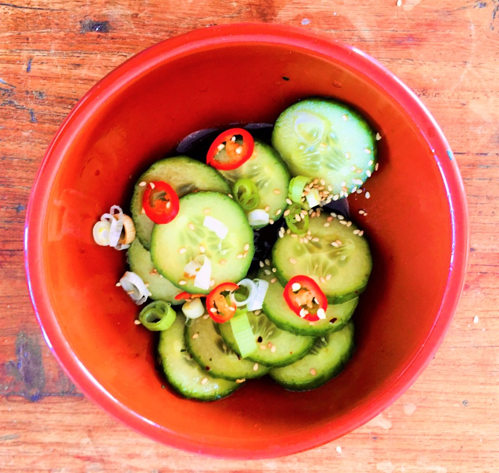 Oi Muchim. Er is een periode in mijn leven geweest waarin ik vaak in de stad Seoul (Zuid-Korea) kwam. Het bijzondere van Koreaans eten is dat de tafel vol wordt gezet met allerlei, meestal gezonde, bijgerechten. Deze worden banchan (반찬) genoemd. Vaak zijn ze vegetarisch of vegan en Oi Muchim (오이무침) is geen uitzondering. Oi betekent komkommer en muchim betekent “met saus bedekken” in het Koreaans. Dit gerecht is snel te maken en is opgenomen in mijn serie appeltje-eitje.