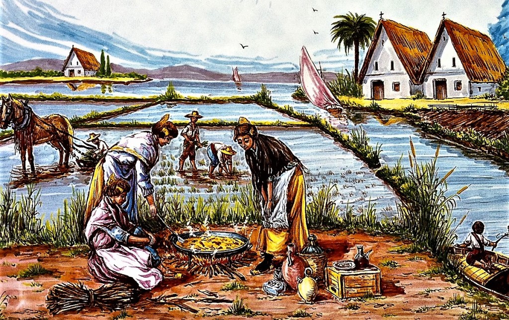 De landarbeiders die in de 18de eeuw op de rijstvelden van Valencia werkten bereidde hun lunch altijd in een “la paella” op een houtvuur met tomaten, ui, slakken, groene en witte bonen en natuurlijk rijst. De rijst werd aan het einde van de bereiding toegevoegd en werd pas van het vuur afgehaald wanneer de rijst droog was gebakken en een krakelend geluid maakte door de vorming van een lekker korstje (de soccarat) onderin de pan. Iedereen at met zijn eigen houten lepel uit de ondiepe platte pan zijn paella.