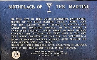 Een goudzoeker, we schrijven 1874, op reis naar San Francisco stopt in de saloon van bartender Julio Richelieu in Martinez. Hij gooit stoer een tabakszakje met goud op de bar en vraagt Julio om zijn fles met whiskey te vullen. De klant vindt dat achteraf toch een beetje weinig en Julio, ook niet de beroerdste, maakt met gin en zoete vermout plus bitters en een olijf een nieuwe cocktail, die hij ter plaatse ‘Martinez’ noemt. Om ervoor te zorgen dat Richelieu gelijk krijgt heeft de gemeente in 1992 een plakkaat neergezet om het nog eens goed uit te leggen.
