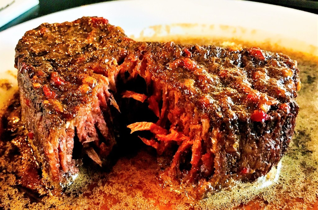 Echt goed, mooi biefstukje en zag er identiek uit als de echte. Even snijden, en ja hoor het bietensap (bloed) en de kokosolie (vet) doen hun werk goed. De binnenkant ziet eruit als gestoofd draadjesvlees. Ik zou het onaangekondigd niet van de echte kunnen onderscheiden.