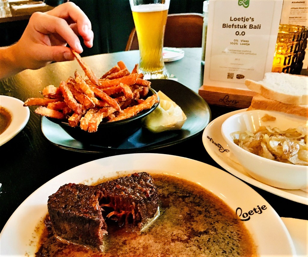 Het is duidelijk geen vleesvervanger in de klassieke manier van denken. De bedoeling is om de mensen die biefstuk lekker vinden een alternatief te geven. Dus eet je vegetarisch omdat je vlees niet lekker vindt dan is deze 0.0 ook niet lekker, en dat is het echte compliment! Persoonlijk denk ik dat de gemiddelde Nederlander het verschil niet proeft en het is verreweg het beste plantaardige vlees wat ik ooit gegeten heb. En heb ik al vertelt dat de buitenkant lekker krokant is zoals een gebraden biefstuk hoort te zijn? De naam Biefstuk Bali 0.0 is Loetje’s knipoog naar alcoholvrij bier.