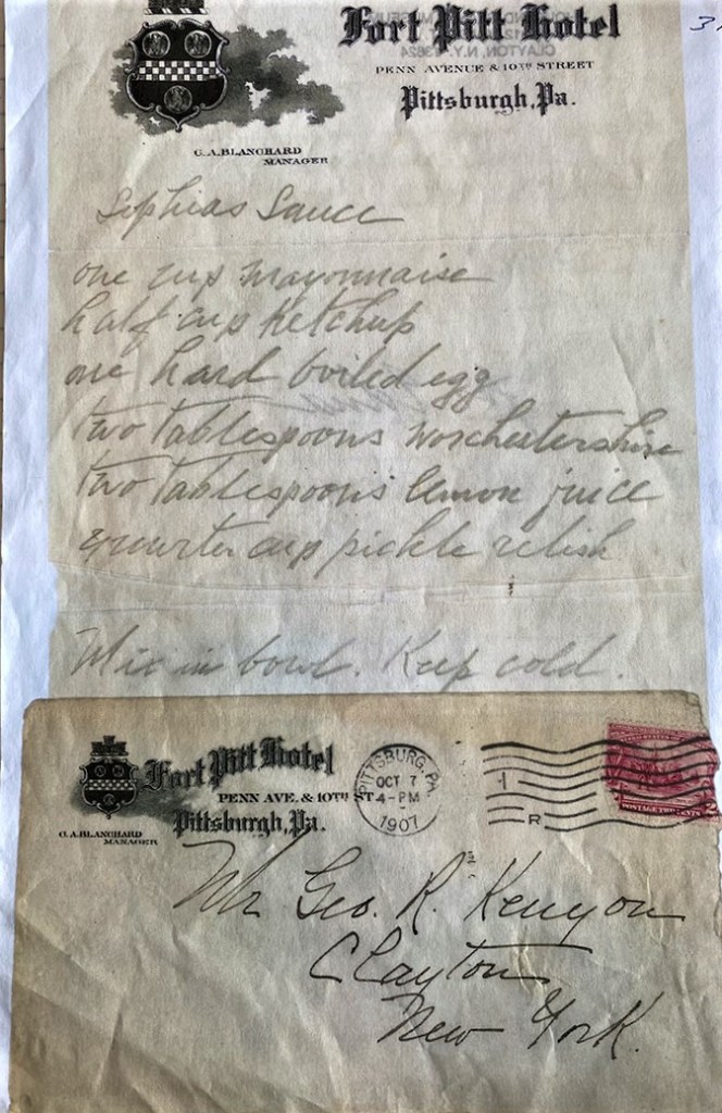 Onze heldin May Irwin deed een vis excursie met George Boldt (rond 1900) en vond de dressing heel erg lekker en kreeg op haar verzoek ook het recept van Sophia. May schreef het recept zelfs op in een brief naar de vrouw van haar binnenhuisarchitect George R. Kenyon en noemde het Sophias sauce. Gebaseerd op de datum van de brief is dit recept gedateerd in 1907. May gaf het recept ook aan haar goede vriendin Louise, de vrouw van George Boldt, die het op zijn beurt aan zijn maître d’hôtel, Oscar Tschirky (1866 – 1950) gaf. Deze zette het op het menu en daarmee bereikte hij het grote (rijke) publiek en werd deze dressing een sensatie. (Helaas is deze dressing nooit op een menu van het hotel gevonden, nog aanwezig in het kookboek van Oscar).