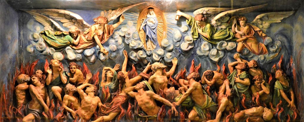 Gedurende de 17de eeuw ontstond in het zwaar katholieke Napels een obsessie met het beeld van witte zielen die uit het rode vagevuur (Purgatorio) werden gered om tot de hemel toe te worden gelaten. Het wit van de eieren (de zielen dus) ontsnappen uit het rood van de tomaten (de rode vlammen van de hel). Laat dit soort symboliek maar aan de katholieken over!