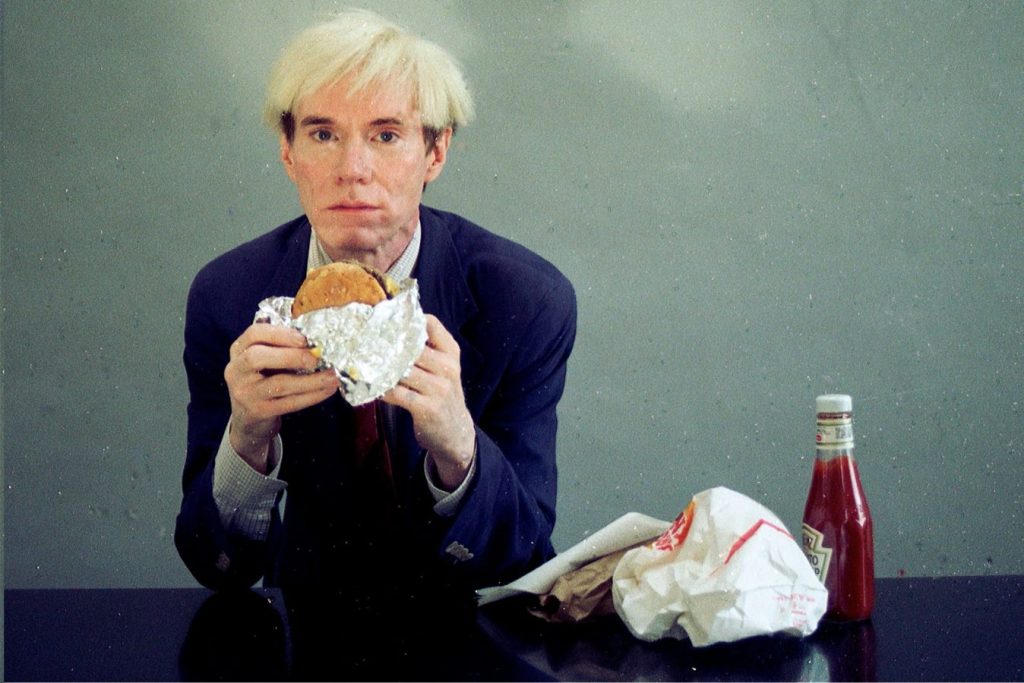 De foto hierboven is van Andy Warhol die in de film uit 1982 66 Scenes from America van Jørgen Lethrustig een hamburger zit te eten, Burger King, dat dan weer wel.