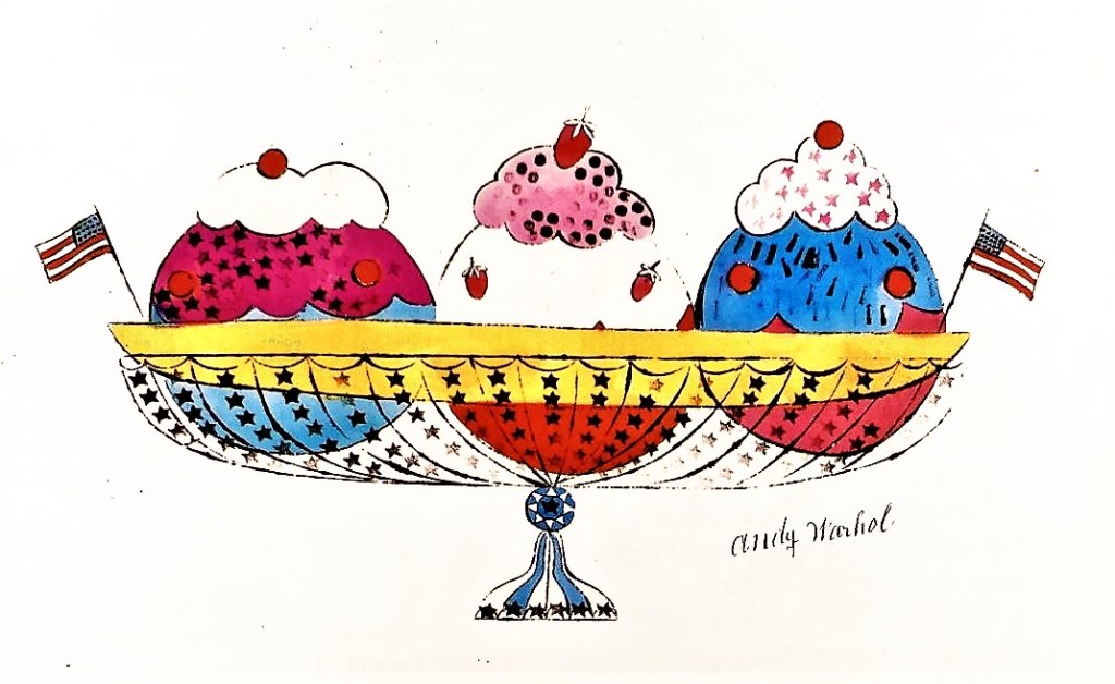 Als zoetigheid je favoriete eten is dan is ijs natuurlijk je favoriete toetje! Voor Andy was ice cream het ultieme van Amerikaans voedsel voor alle mensen. Met de kitscherige kleuren paste consumptie ijs precies in zijn Pop Art filosofie van kunst dat lekker, herkenbaar en mooi van vorm is. En het, bijna iconische Amerikaanse nagerecht, de sundae (zeg maar onze sorbet) bestaande uit bolletjes gekleurd ijs overgoten met een saus was natuurlijk het ultimum! Zijn tv-commercial uit 1968 voor Schrafft’s Restaurants in New York City, noemde hij Underground Sundae. Zijn hele leven lang at Andy ijs in alle soorten en maten, in 1996 publiceerde de Andy Warhol Foundation for the Visual Arts zijn persoonlijke tekeningen over eten in een miniboekje met de titel Yum, Yum, Yum waarin veel yummie ijsjes in staan afgebeeld.