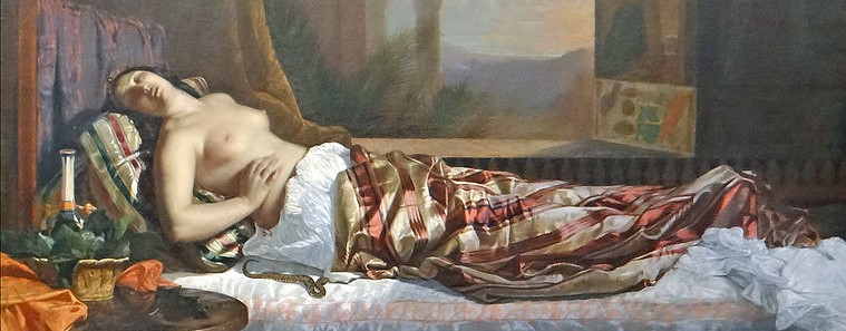 Deze mooie vrouw moest zich handhaven in moeilijke tijden die zich afspeelde tijdens het romeinse rijk. Het pakte niet goed uit en de koningin liet een mandje met lekkere zoete vijgen brengen met daaronder een verborgen adder (cobra) die ze tegen haar boezem aandrukte om zelfmoord (12 augustus in 30 v.Chr.) te plegen. Er zat dus een addertje onder de vijg!