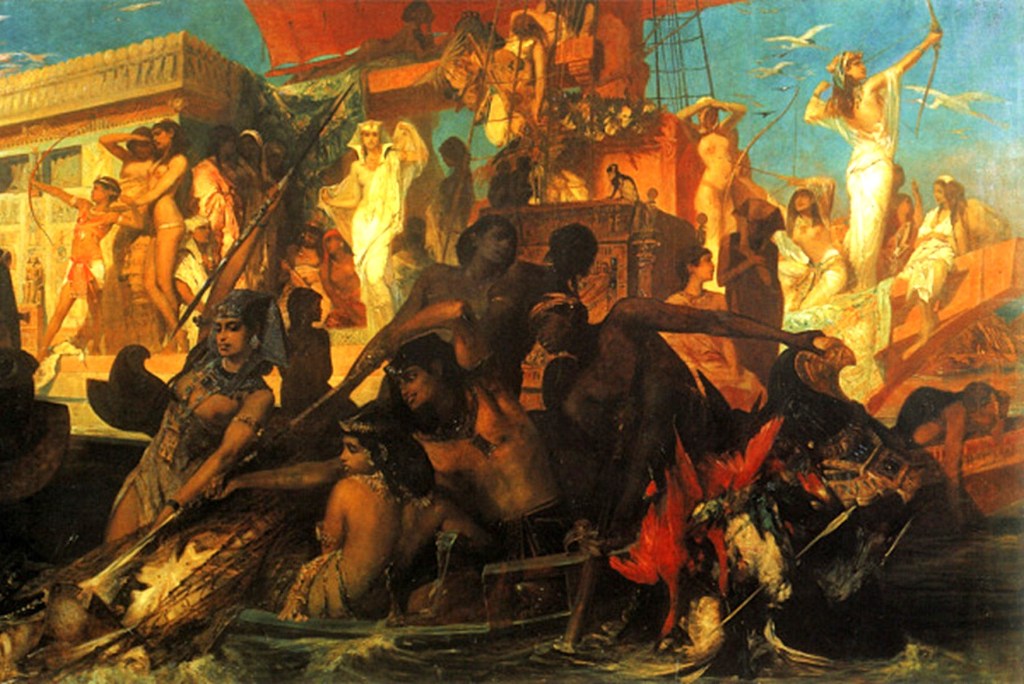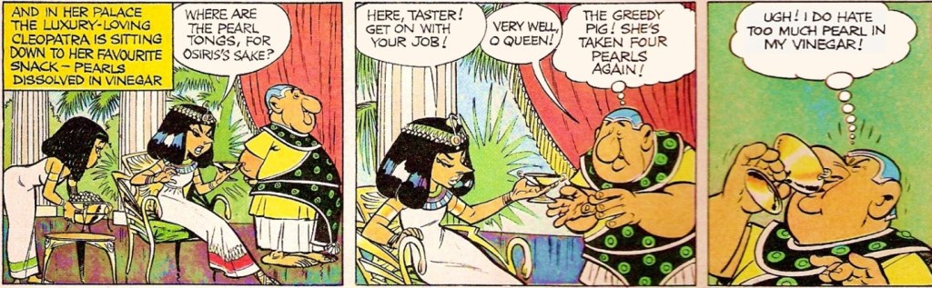 Tijdens de onderzoek sessies die ik doe om kunstenaars te vinden voor mijn serie kunst en eten stuit ik veel op kunst gerelateerd aan het (culinaire) leven van Cleopatra, de koningin van de Egyptisch keuken. We weten daar vrij veel van omdat er over geschreven is door schrijvers uit de oudheid zoals tijdgenoot Horatius (65 – 8 v.Chr.) en later Plinius de Oudere (24 – 79), Plutarchus (46 – 120) en anderen. Ook kunstenaars (striptekenaars, filmregisseurs, en kunstschilders) hebben zich volop gestort op deze Egyptische koningin en haar (culinaire) uitspattingen. We hebben echter ook andere historische en archeologische (kunst) bronnen (papyrusrollen, muurdecoraties) die ons vertellen over de eetgewoonten van Egyptenaren in de tijd van Cleopatra. Parels werden er niet gegeten maar de legende dicteert van wel, mits er voorgeproeft is natuurlijk. Maar daarover later!