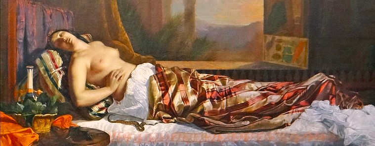 Het is bekend dat Cleopatra erg van vijgen hield en het was dan ook normaal dat ze vlak voor het slapen gaan er een schaaltje van in haar privé vertrekken liet brengen. Haar geliefde Marcus had iets teveel vijandn gemaakt in de persoon van Octavianus die Egypte in augustus 30 v.Chr. binnen viel. Marcus pleegde zelfmoord maar Cleopatra mocht toch nog haar vriendje laten begraven in hun speciaal gebouwde graftombe. Enkele dagen later liet onze koningin een schaaltje vijgen brengen met, volgens de legende, onder de bladeren een giftige slang verstopt (een aspe). Ze drukte deze slang op haar blote boezem en overleed door het gif. Uiteraard werd deze gebeurtenis in de middeleeuwen aangegrepen om daar grote schilderijen van te maken omdat functioneel naakt het enige was dat door de kerk werd goedgekeurd! Uiteraard als er maar een aspe en een mandje vijgen (bladeren) op stond.