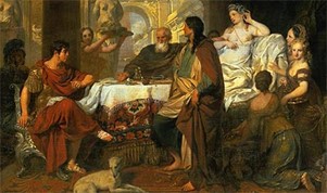 Antonius had veel culinaire verhalen gehoord van zijn vriend Julius en wilde een date met Cleopatra en vroeg haar om hem te ontmoeten in Tarsus (in het huidige Turkije). Ze zou hem ontmoeten in de haven en kwam dus per boot die ze liet versieren met goud en albast en ze had de zeilen laten impregneren in geparfumeerde olie zodat de wind haar aankomst al aankondigde, zelf was ze schaars gekleed als venus, de Romeinse godin van de liefde. De boot was volgestopt met de lievelings gerechten van Cleopatra, ze hield namelijk veel van fruit (watermeloen, vijgen, dadels) en vlees zoals duif, schapenvlees en zeevruchten. De verleiding kon beginnen. Marcus hield zelf ook van lekker eten, vooral dure exotische gerechten en cleopatra wilde indruk maken door te zeggen dat Marcus in Egypte een maaltijd dat 100 uur zou duren en dat 10 miljoen sestertiën (500.000 Euro) zou kosten, het jaar salaris van 10.000 romeinse soldaten, voorgeschoteld zou krijgen. Nou dat kon natuurlijk niet vond Marcus dus er werd een weddenschap afgesloten. Dit banquet van Cleopatra is onder andere beschreven in het boek Naturalis Historia (9.119‑21) geschreven door Plinius de Oudere (24 – 79 na Chr.). Lucius Plancus (85 – 15 v.Chr.), was er volgens Plinius bij als scheidsrechter. Het diner begon gewoon met de lievelingsgerechten van Marcus voornamelijk geroosterd zwijn, honing, kaas, en veel wijn. Cleopatra hield van plat brood, olijfolie, pickles (augurken), hummus en de verfrissende rode meloen. Op het honderste uur liet onze slimme koningin een tafeltje neerzetten met een kommetje azijn en deed daar een van de parels van haar oorbel in en dronk het op. Volgens Plinius bezat Cleopatra de twee grootste parels aller tijden, die haar door oosterse koningen waren nagelaten. Lucius Plancus stopte Cleopatra voordat ze de tweede parel wilde oplossen en maakte haar winnaar van de weddenschap. Niemand weet dat, maar een parel lost niet zomaar op in azijn dus de slimme verleidster was niet echt haar parel kwijt!