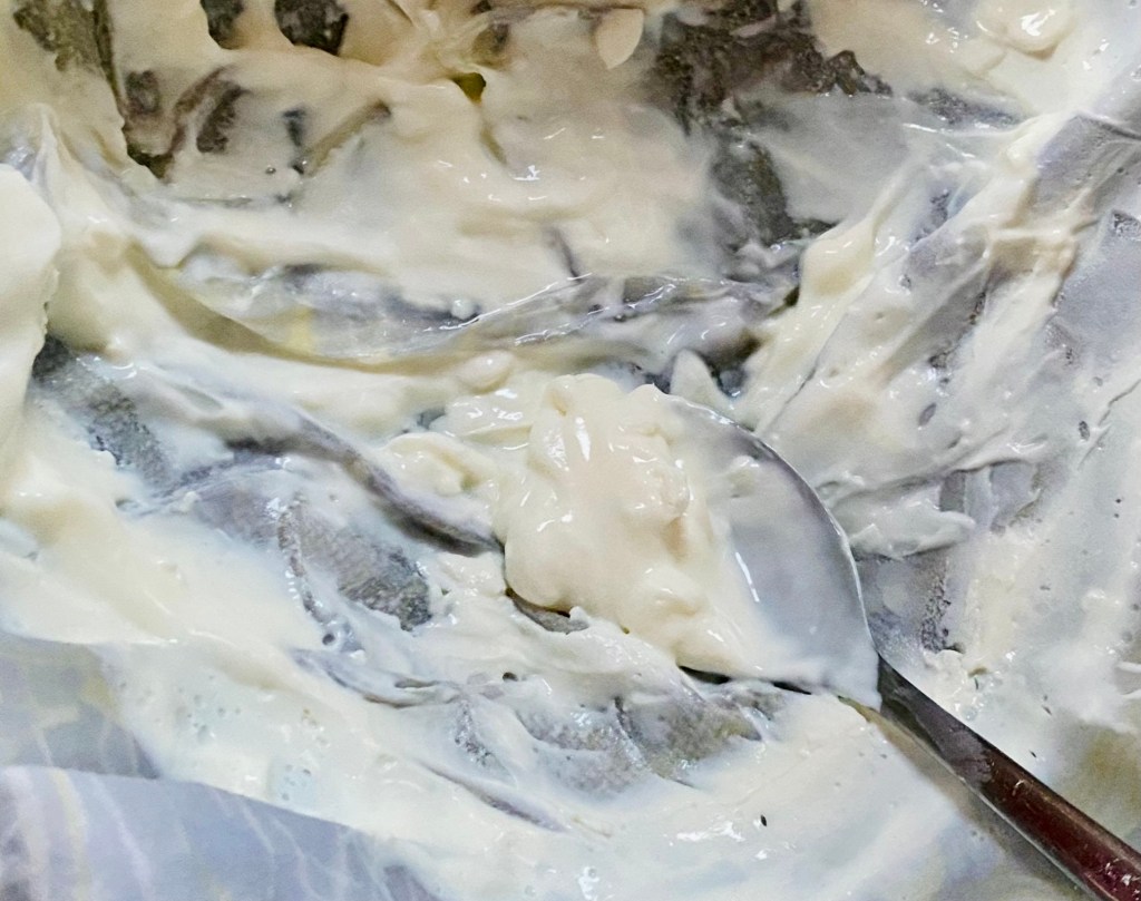 In de supermarkt worden ook pakken karnemerk verkocht maar dat is magere melk waaraan melkzuurbacteriën worden toegevoegd. Deze zure melk heet dan karnemelk maar dat is het niet! Echt iets voor de Keuringdienst van Waren. Ik heb deze gemaakt met de AH karnemelk en het werd lekker romig, dat viel me niet tegen.