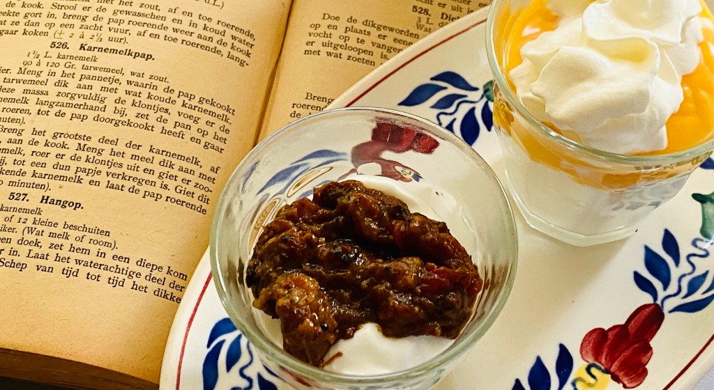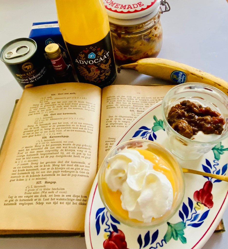 Vroeger, in de goede oude tijd, serveerde ze hangop gewoon met beschuit en suiker. Tegenwoordig kan alles. Als toetje (dessert) kun je er slagroom (geklopt) met vanillesuiker doorheen roeren en serveren met zomerfruit. Op de foto heb ik advocaat met slagroom gedaan want dat past bij de 60ger jaren en is heeeeeel erg lekker. Wat ook heel lekker is zijn de hartige varianten. Op de foto staat de hangop met de zelfgemaakte bananenchutney met wat kokosroom door de hangop. Maar nogmaals alles kan!