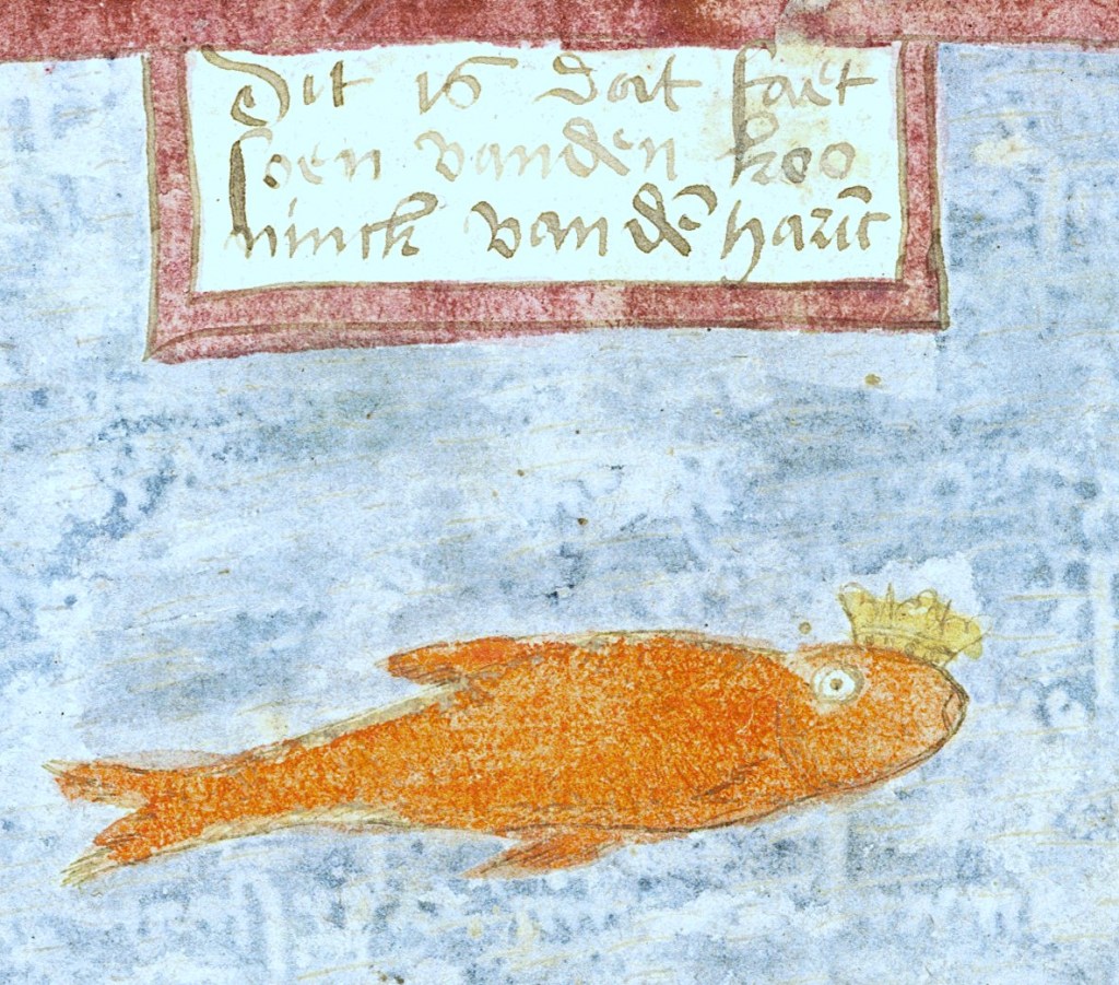 Adriaen Coenen (1514–1587), een vishandelaar uit Scheveningen, schreef in de 16e eeuw zijn Visboeck (1577 – 1581). Hét boek over vis, en dus ook over haring. Dit handgeschreven manuscript zit vol met zeer mooie plaatjes die Adriaen zelf getekend heeft. Met daarin de allereerste afbeelding van een haring met een kroontje, de koningsharing. Vissers geloofden in die tijd dat de grote scholen haring geleid werden door een rode koningsharing. Adriaen heeft in zijn boekje getiteld de Haringkoningboeck de rode Mul aangewezen als meest waarschijnlijke kandidaat. Ikzelf denk dat zijn vriend Willem van Oranje (1533 – 1585), die Coenen een eerder verloren gegaan, exemplaar van dit boek cadeau heeft gegeven en dan moet je natuurlijk wel de koningsharing een oranje kleur geven met een kroontje, net als de oranje wortel overigens. In het openbaar was oranje gezindheid niet altijd handig in die tijd. Maar zie deze uitleg maar als een eigen chauvinistische interpretatie van mij. De naam koningsharing is wel blijven hangen omdat later het gebruikelijk werd om het eerste tonnetje Hollandse Nieuwe aan de koning of koningin te schenken. Bovendien is deze (zilveren) haring met kroontje zowel in de Scheveningse vlag al die van Enkhuizen terecht gekomen (zie onderaan). Goed, laten we naar de vis zelf gaan!