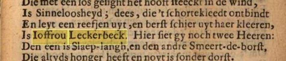 De rotterdammer Erasmus (1466 – 1536) schreef in 1509 het boek de Lof der Sotheyd in het Latijn en dat werd in 1659 vertaald door Jacob Westerbaen (1599 – 1670) in het Nederlands. Juffrouw Lecherbeck wordt in dit boek beschreven als iemand die van lekker eten houdt, zo erg zelfs dat ze berst schier uyt haer kleeren. In de 17de eeuw is het woord lekkerbek ingeburgerd als zijnde een persoon die van goed eten houdt en vaak last heeft van lekkere trek of lekkere honger.
