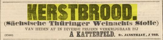 Wat wel waar is, is dat de oudste advertentie voor verkoop van ‘Weihnachts Stollen’ in Nederland vlak voor kerst 1870 is geplaatst door Adolph Katterfeld uit Gotha in Saksen die zich als bakker in 1838 op de Sint Jansstraat 33 in Amsterdam vestigde. Hij is begonnen om de echte Sächsische Thüringer Weihnachts Stollen in Nederland te verkopen als kerstbrood. Tegenwoordig kennen wij de kerststol als een opgevouwen brood (van oorsprong de vorm van het Christuskindje) bereidt met bloem, boter, krenten, rozijnen, sukade en amandelspijs. Tevens doet dit type brood ook als dienst als Paasstol (officieel zonder poedersuiker) zodat het veel langer verkocht kan worden in de supermarkten, vooral als je er de naam ‘feestbrood’ aan geeft.