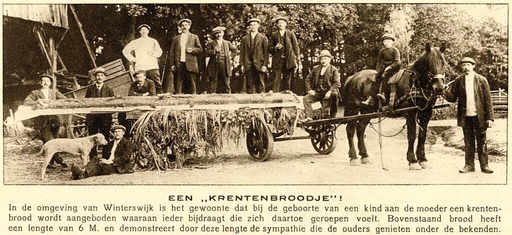 De Etymologiebank vertelt ons dat er een weggenbacker (al in 1369) bestond en die bakte destijds tijdens de feestdagen wig vormige witbroodjes. Feestdagen werden, naast Pasen, Pinksteren en Kerst, opgerekt naar alles wat er te vieren was, dus geboorte van een kind, je 50-jarige verjaardag, dopen en de begrafenis van je schoonmoeder. De basis van dit brood is nog steeds bloem, boter, krenten en rozijnen. En zo ontstonden de boterwegghe (1450), de krentewegge (1893) en de kerstwegge (1898) voornamelijk in Twente en Drenthe. De moeder van een pasgeboren baby zou aansterken met een royale krentenwegge en zo ontstond de traditie om met een enorme krentenwegge (soms wel 2 meter) met de mannen op te halen en naar de kraamvisite te vervoeren en die gezamenlijk op te eten en natuurlijk uit te delen aan de mensen in het dorp.