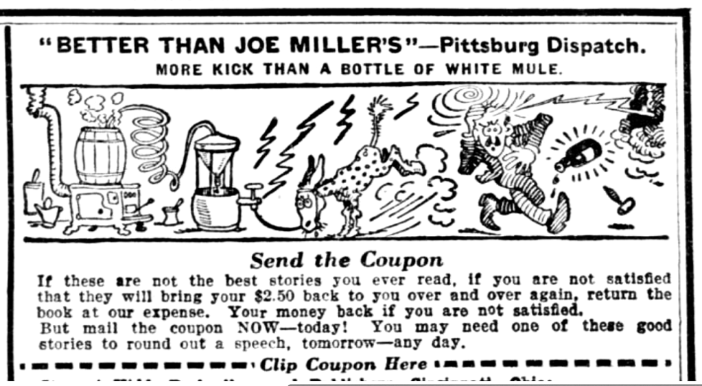 Er werd ook veel gelachen om de drooglegging en in een advertentie van het grappen boekje van Joe Miller uit 1923 geeft aan dat de kick van een muilezel verband kan houden met het drankje white mule. Dus nu op zoek naar Moscow in de naan van deze cocktail.