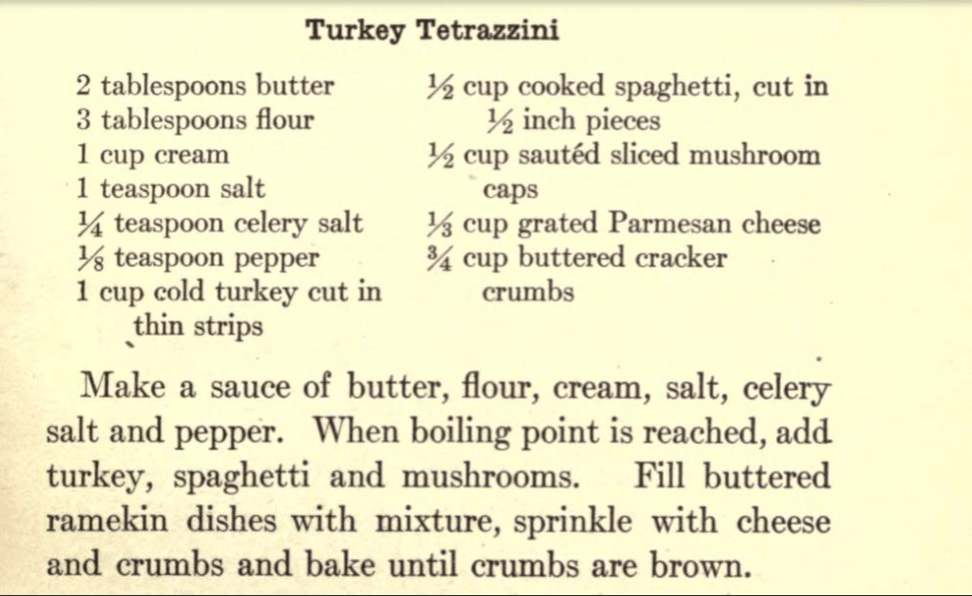Tetrazzini is tegenwoordig een Amerikaans gerecht gemaakt met blokjes gevogelte of zeevruchten in een saus van boter, room of melk en kaas, op smaak gebracht met sherry of witte wijn. Sommige recepten gebruiken een bechamelsaus, mornaysaus of Campbell’s roomsoep. Het wordt gecombineerd met of geserveerd over pasta, vaak gegarneerd met broodkruimels of kaas uit de oven. Ik geef je hier meteen het oudste recept die ik kan vinden uit het tijdschrift American uit Baltimore van 28 oktober 1909, Baltimore ligt niet ver boven New York aan de Oost kust van de VS.