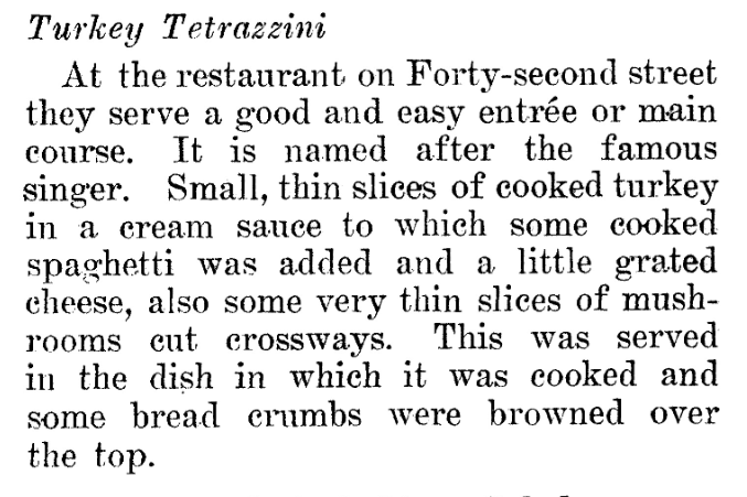 Ik ben geen culinaire historicus maar het valt me wel op dat er op blz. 143 van dit kookboek een recept staat met de titel Knickerbocker Supreme of Chicken wat bestaat uit kipfilet met ‘heavy cream’ en bloem in een pannetje met boter gebruind en hop in de oven, geserveerd met een saus dat bestaat uit boter, bloem, kippenbouillon, room, snufje paprika en champignon. Blijkbaar had hotel Knickerbocker al wel een soort voorganger van onze Tetrazzini op het menu want als je alles in een ovenschaal doet met pasta en Parmezaanse kaas erover dan ben je er al als je indruk wilt maken op een Italiaanse dame (pasta en Parmezaanse kaas).
