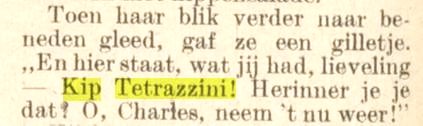 Wat ik zelf wel typerend vind is dat chef Victor Hirtzler van het Hotel St. Francis uit San Francisco in zijn boek met menu suggesties The Hotel St. Francis Cook Book uit 1919 twee Tetrazzini gerechten noemt, de eerste voor een Italian Dinner (april 27, 1917) met potatoes Tetrazzine en een andere met het toetje peach Tetrazzini. Dus geen kalkoen of kip! Waren de Tetrazzine gerechten al te bekend om te claimen?